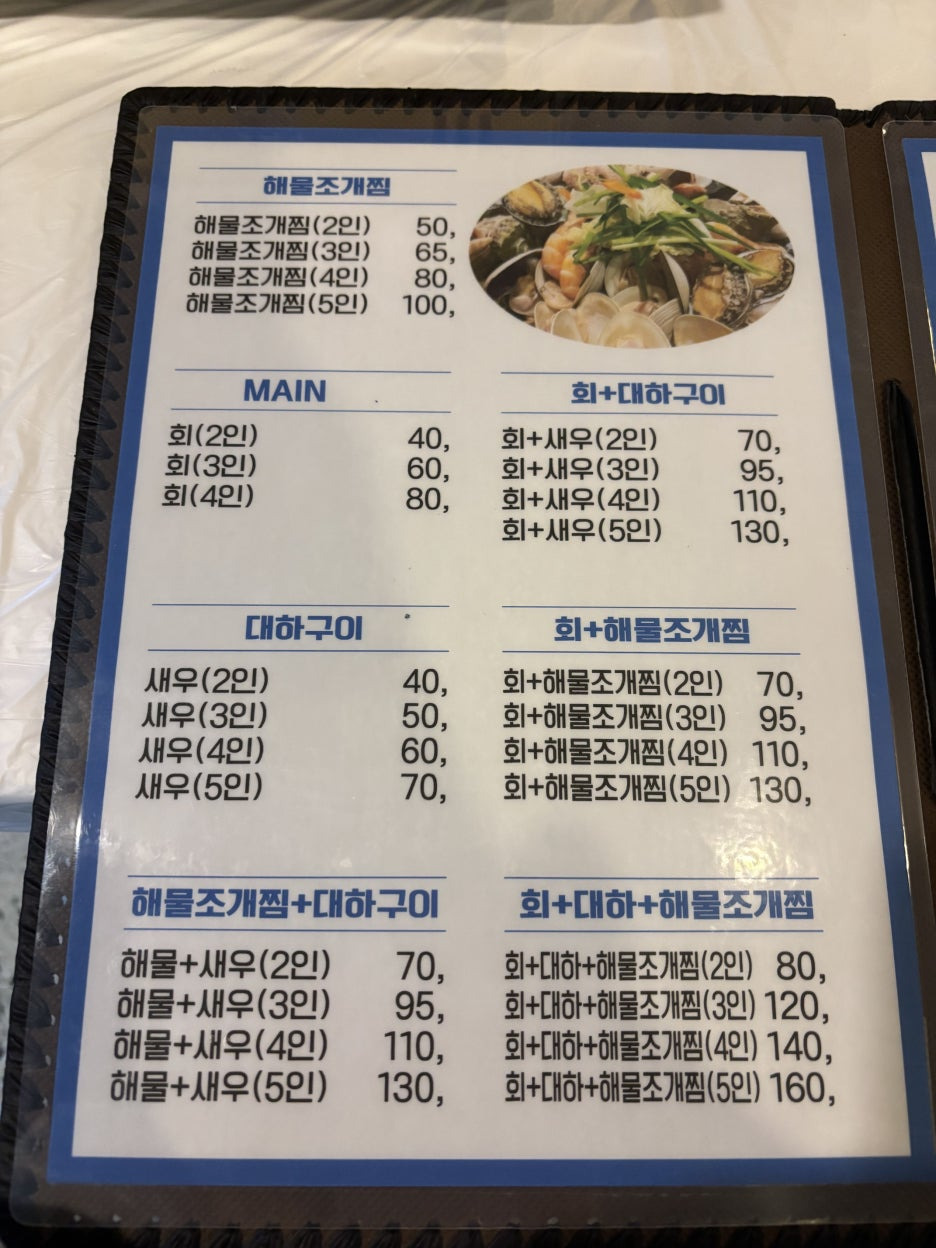 저희는 이날 회+해물 조개찜 4인으로 먹었어요!